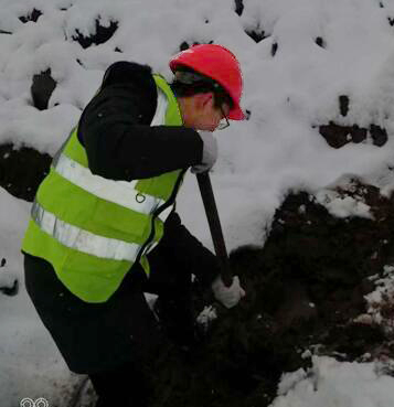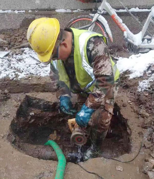 在積雪和泥濘中人工探挖漏水點(diǎn)