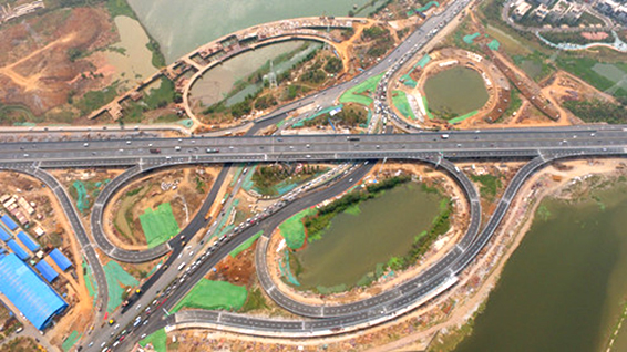 野芷湖立交橋作為連接三環(huán)線與南大門的重要交通樞紐,原有的4股上下橋匝道已無法滿足日益增加的車流量,成為當(dāng)?shù)亟煌ǖ摹澳c梗阻”。集團(tuán)公司投資建設(shè)的新野芷湖立交橋是其中重要的節(jié)點(diǎn)工程,將建成全市第一座分離式集散車道的樞紐立交,其中南北兩側(cè)共計(jì)4條匝道在改造后將變成南北各4條匝道,同時在三環(huán)線上增加幫寬橋,使單側(cè)橋面寬度增加2車道,專門用于分流下行匝道車輛,較好地起到行車疏導(dǎo)作用。