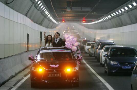 2008年12月28日,武漢長(zhǎng)江隧道通車,一對(duì)新人途經(jīng)隧道駛向幸福生活。